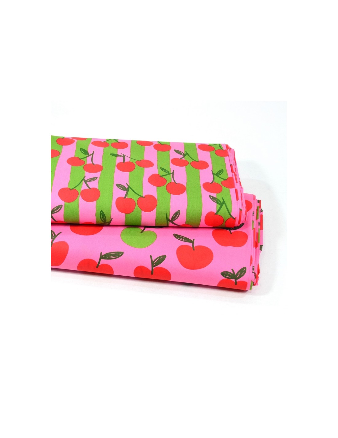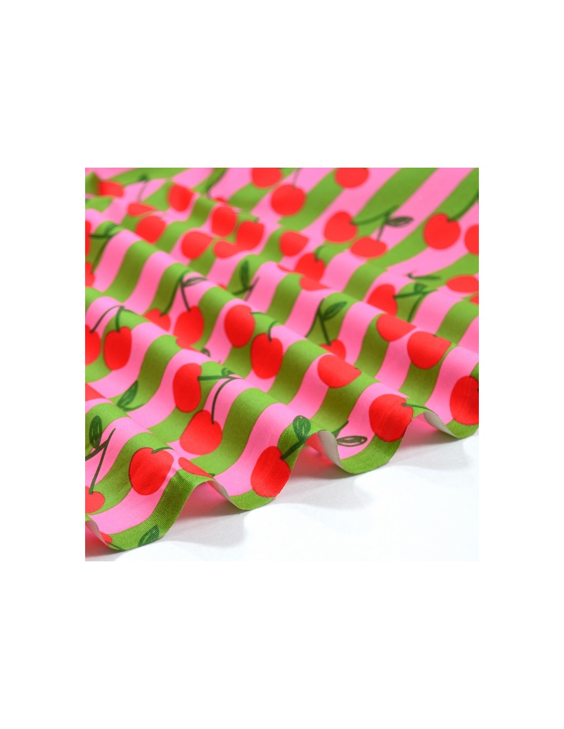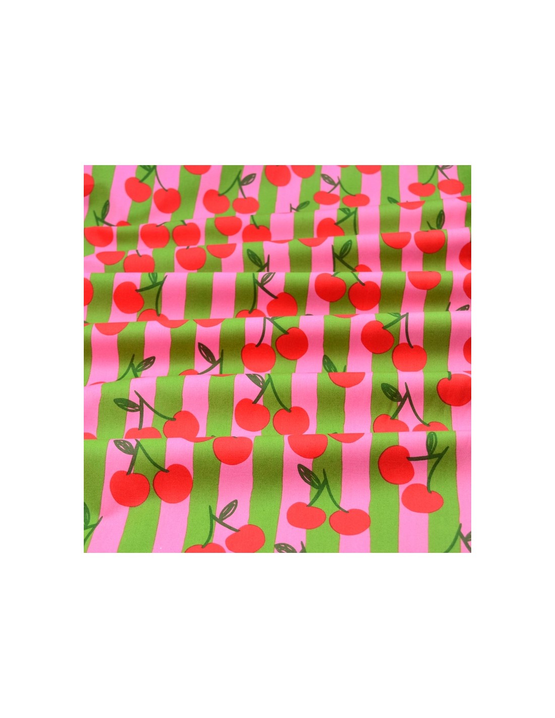 Tissu Popeline de Coton - Les Cerises - Rose & Vert