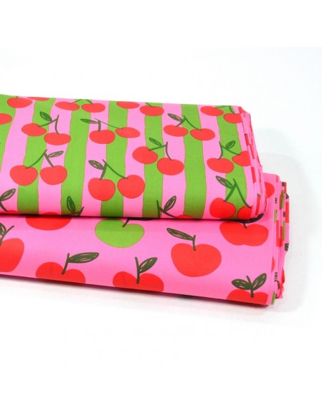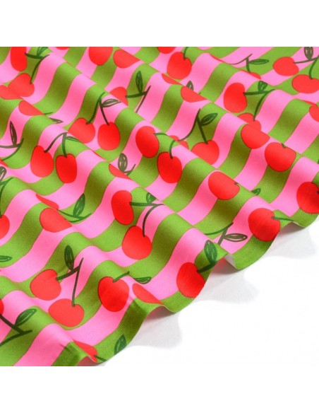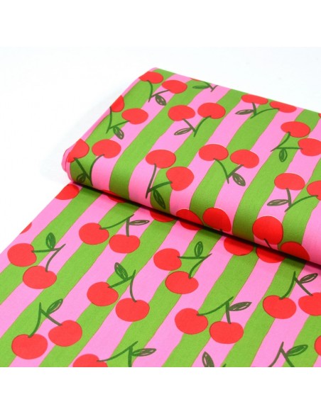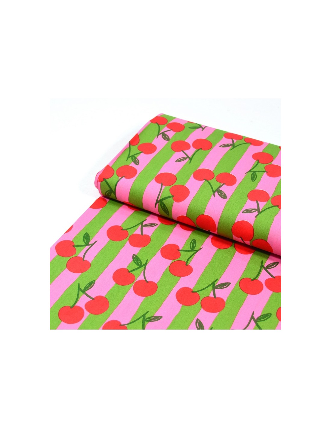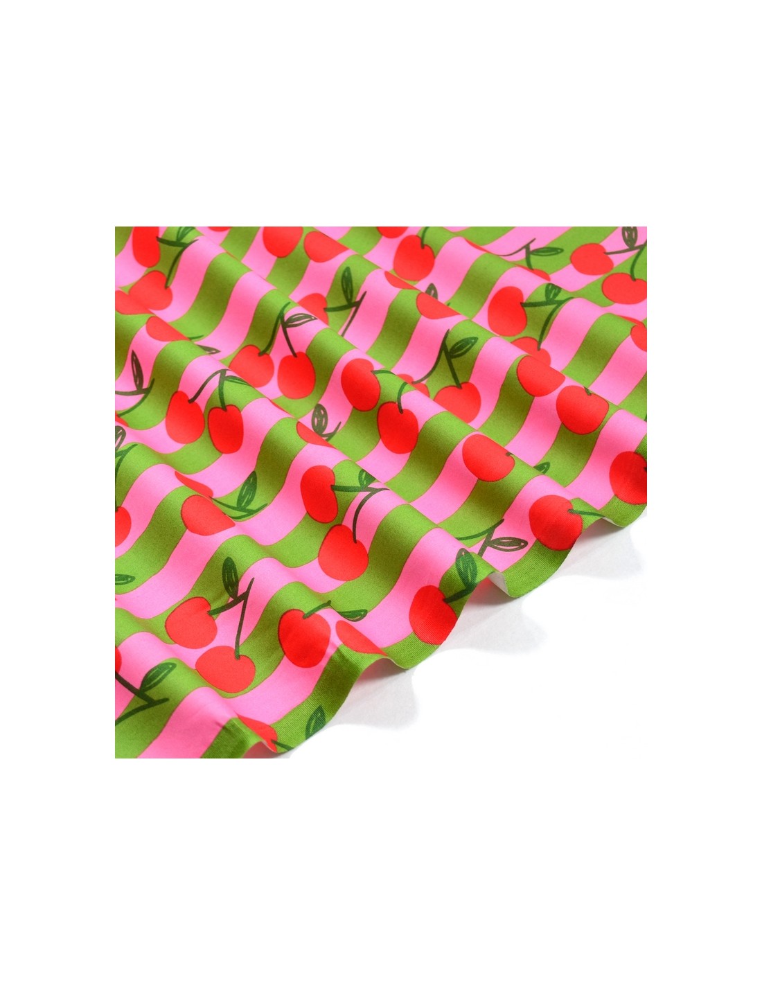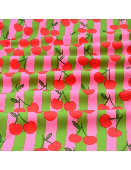 Tissu Popeline de Coton - Les Cerises - Rose & Vert