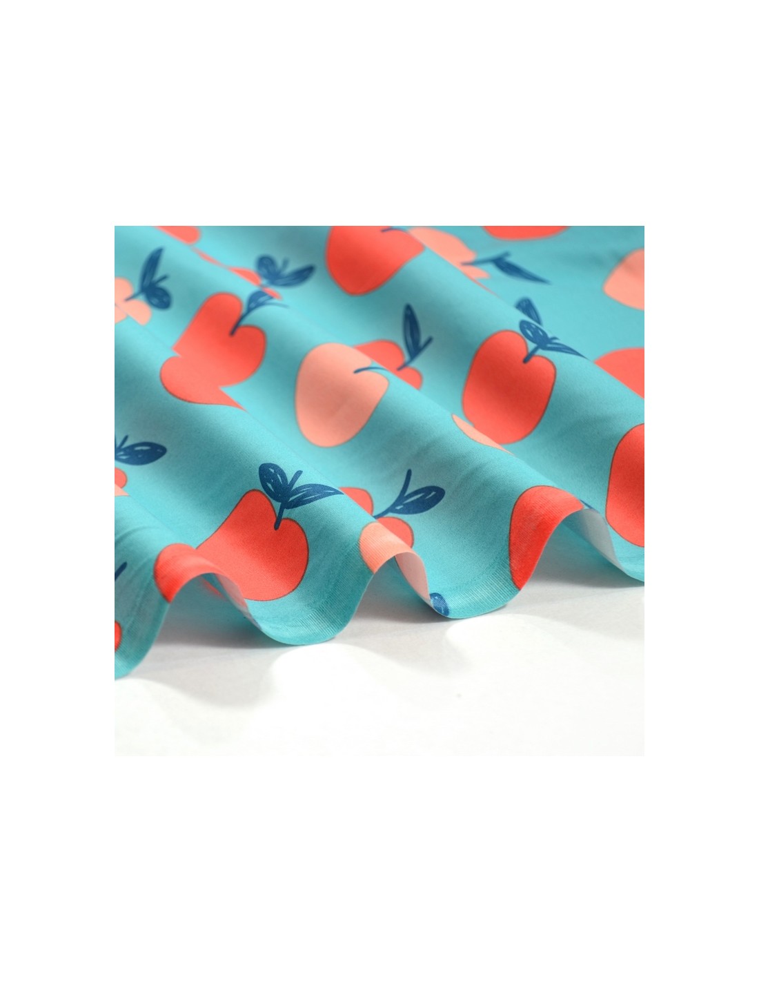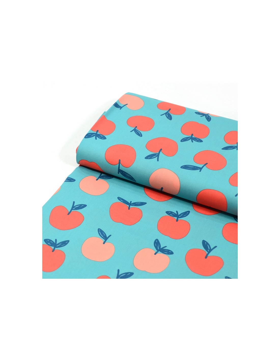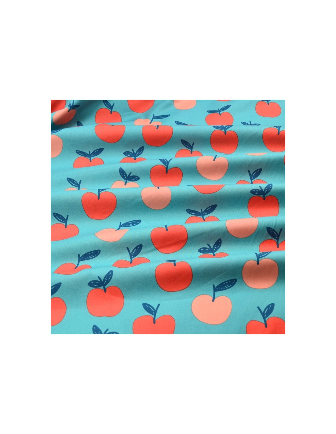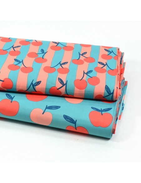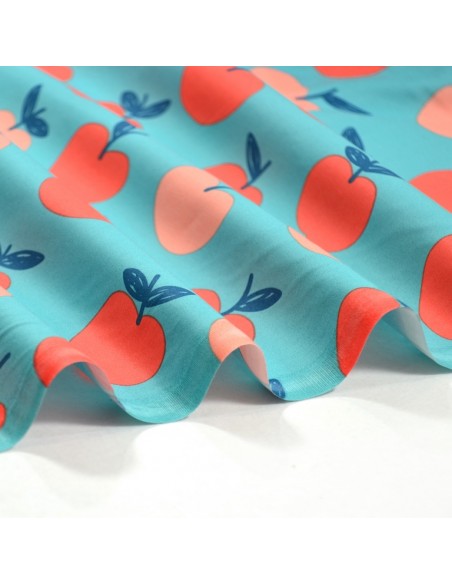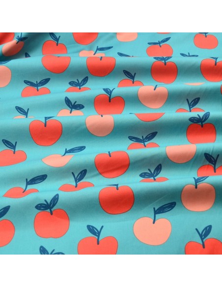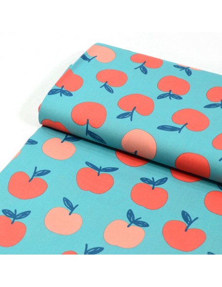 Tissu Popeline de Coton - Les Pommes - Bleu & Rose Pêche