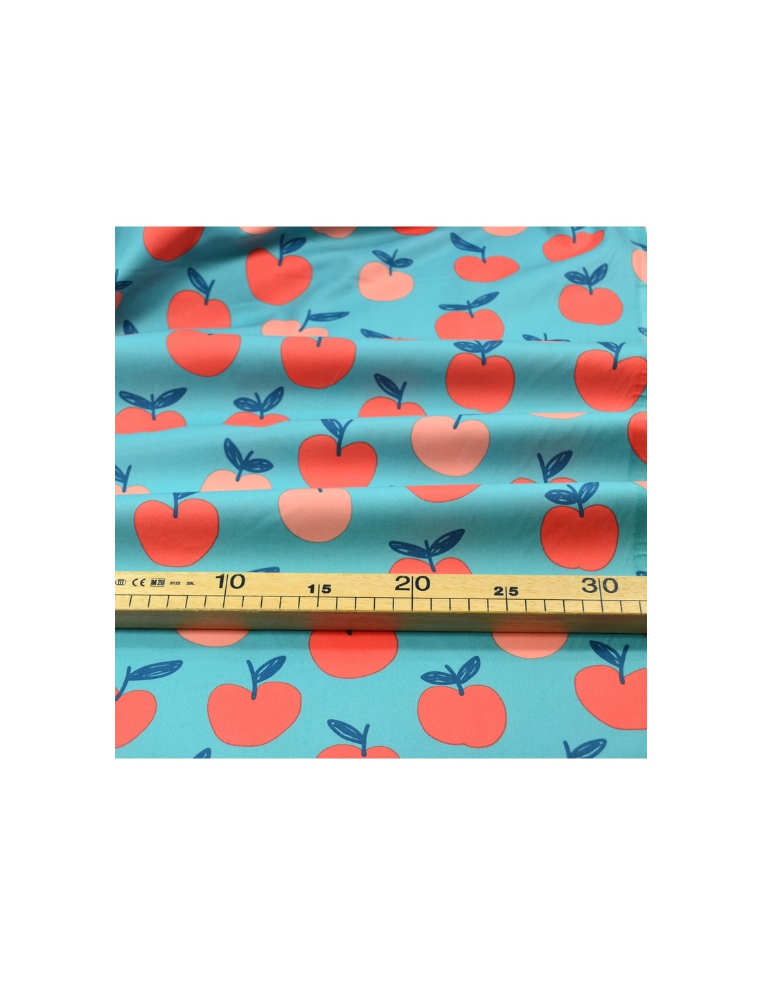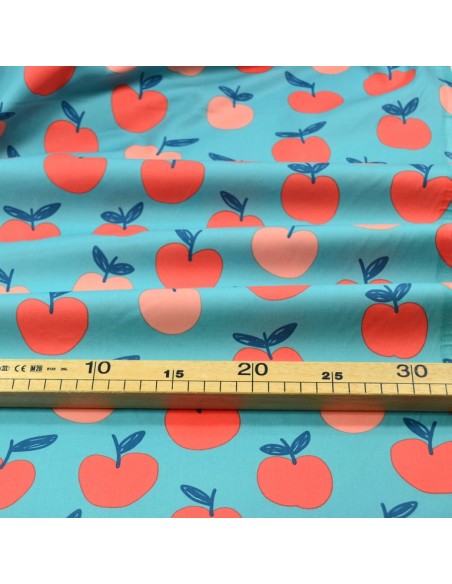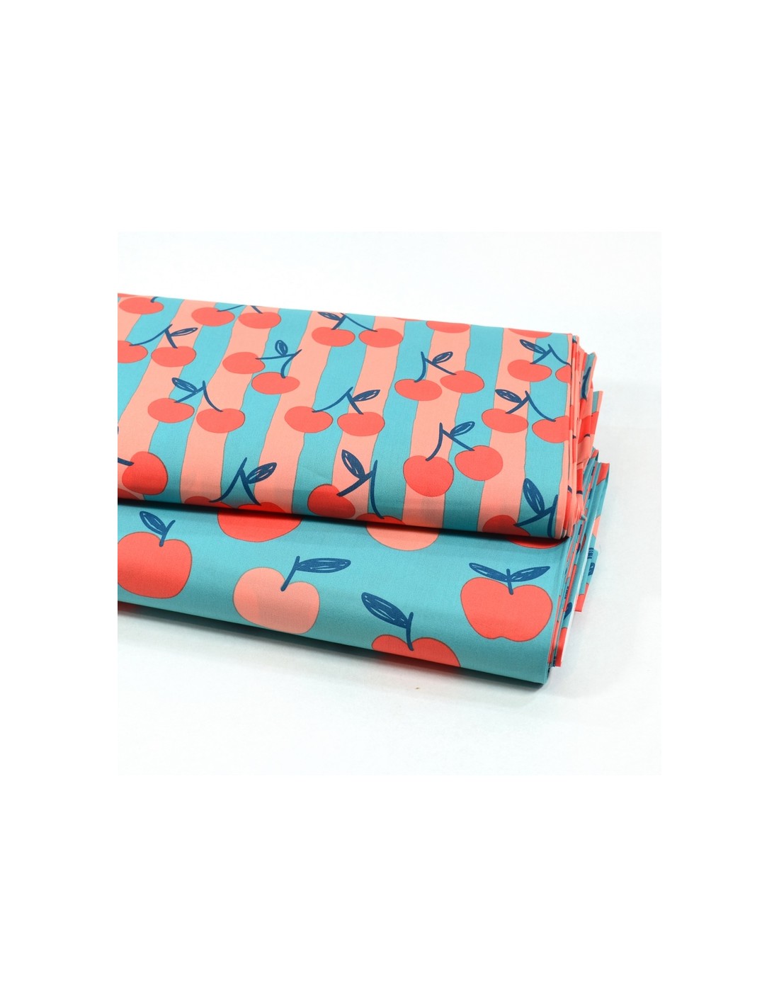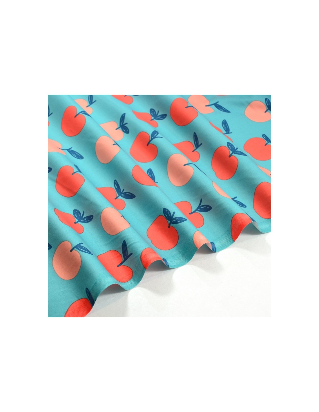 Tissu Popeline de Coton - Les Pommes - Bleu & Rose Pêche