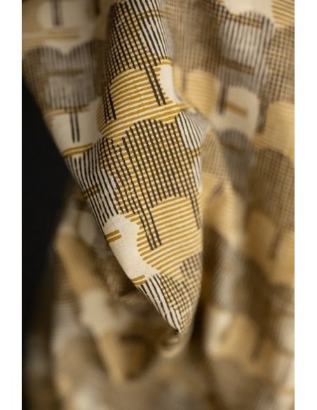 Fabriqué à la main en Inde selon la tradition du block print : un tampon de bois sculpté, trempé dans une teinture végétale puis appliqué à la main sur le tissu. Des méthodes ancestrales qui permettent d'obtenir des teintes naturelles et des irrégularités qui font tout le charme du tissu.