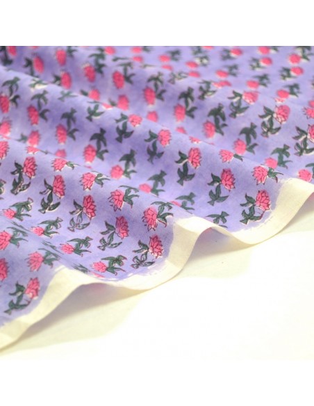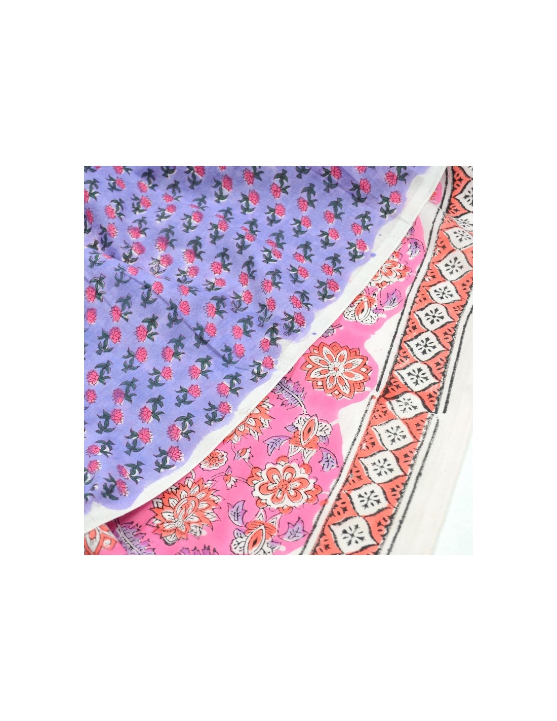 Fabriqué à la main à Jaipur en Inde selon la tradition du block print : un tampon de bois sculpté, trempé dans une teinture végétale puis appliqué à la main sur le tissu. Des méthodes ancestrales qui permettent d'obtenir des teintes naturelles et des irrégularités qui font tout le charme du tissu.