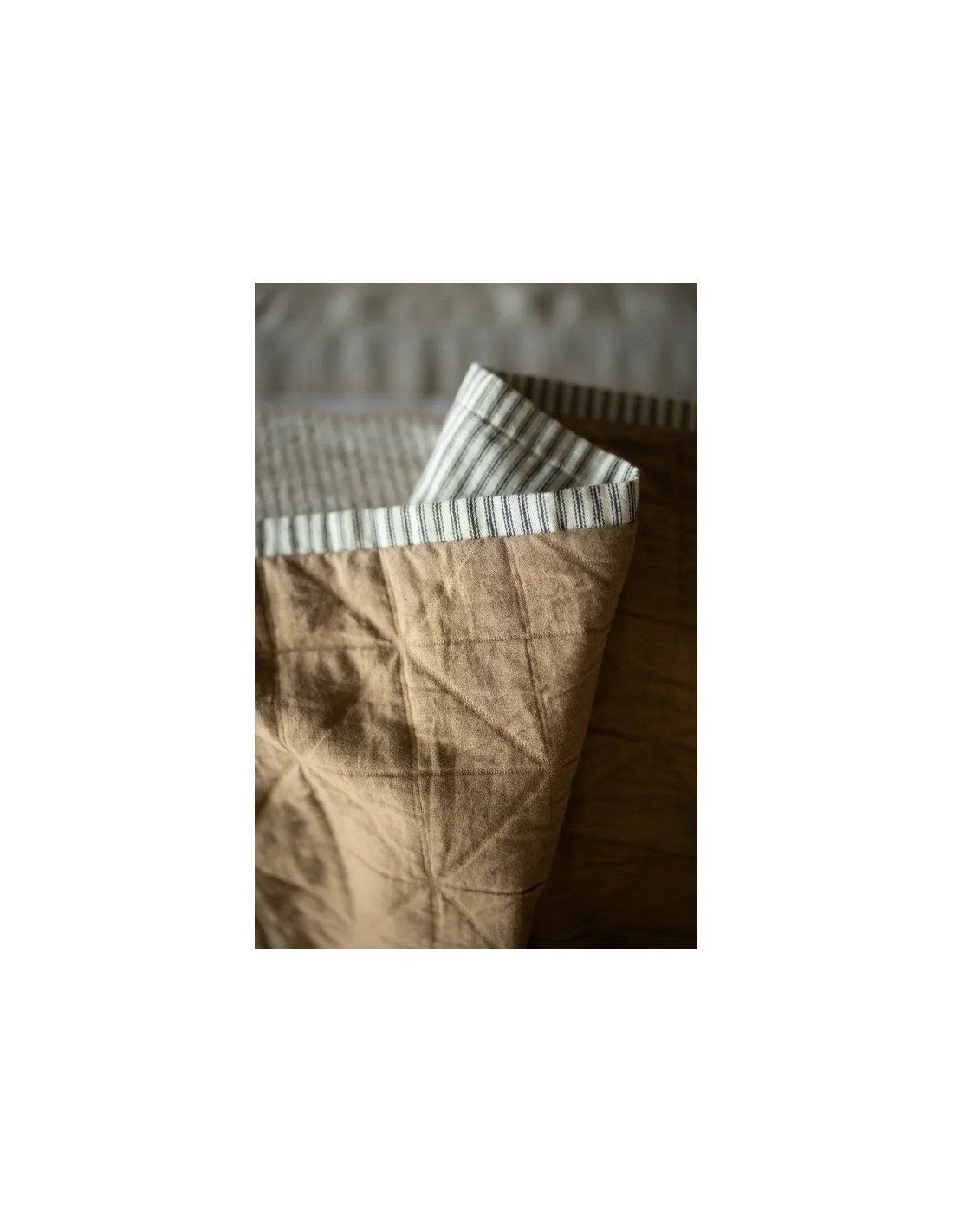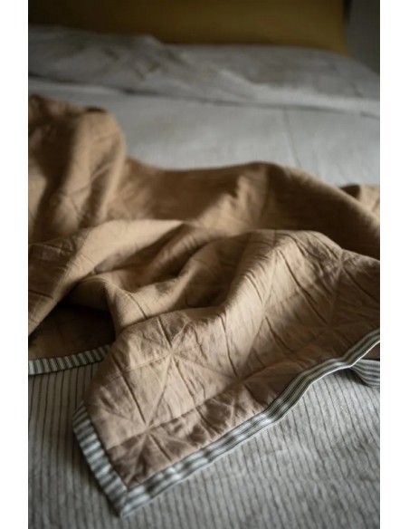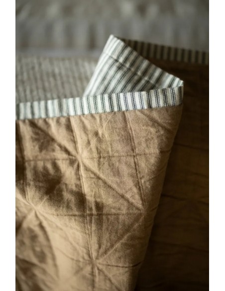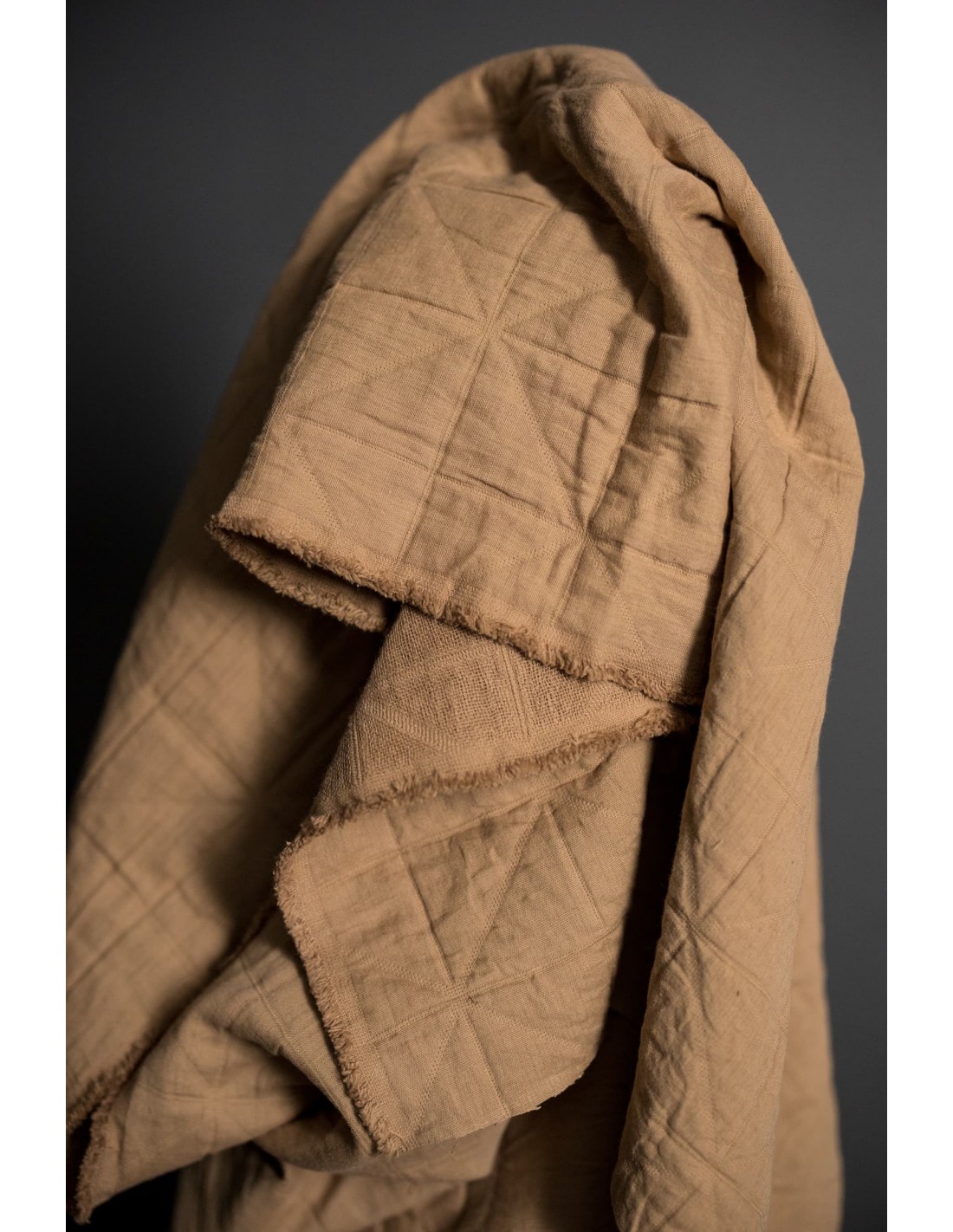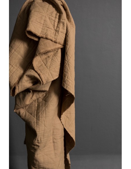 Plusieurs couches de coton se superposent et le tissage selon la technique du Jacquard lui donne son aspect matelassé. L'endroit est un coton fin et l'envers est une gaze de coton.