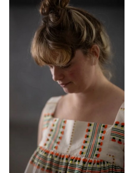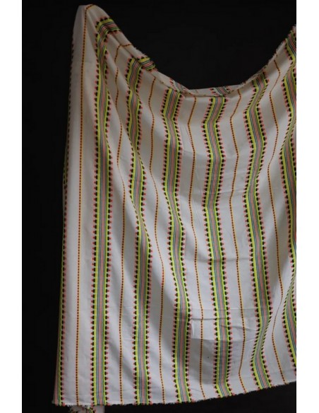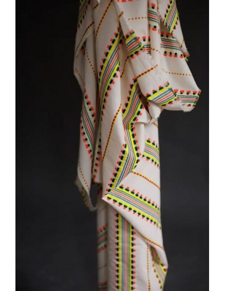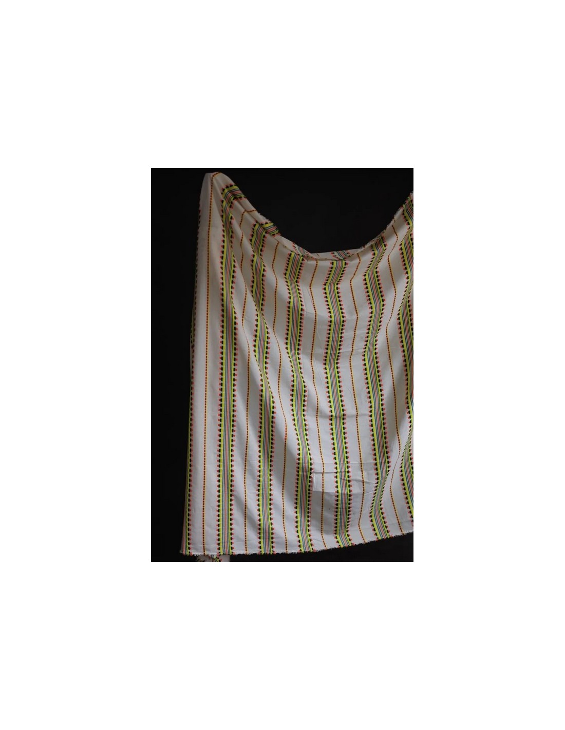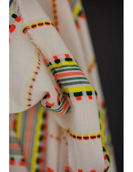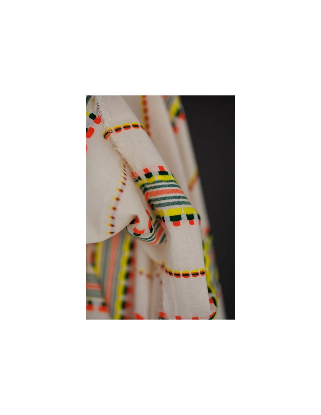 Un coton doux et vibrant, blanc, avec des touches de vert, orange et jaune fluo tissées en léger relief.