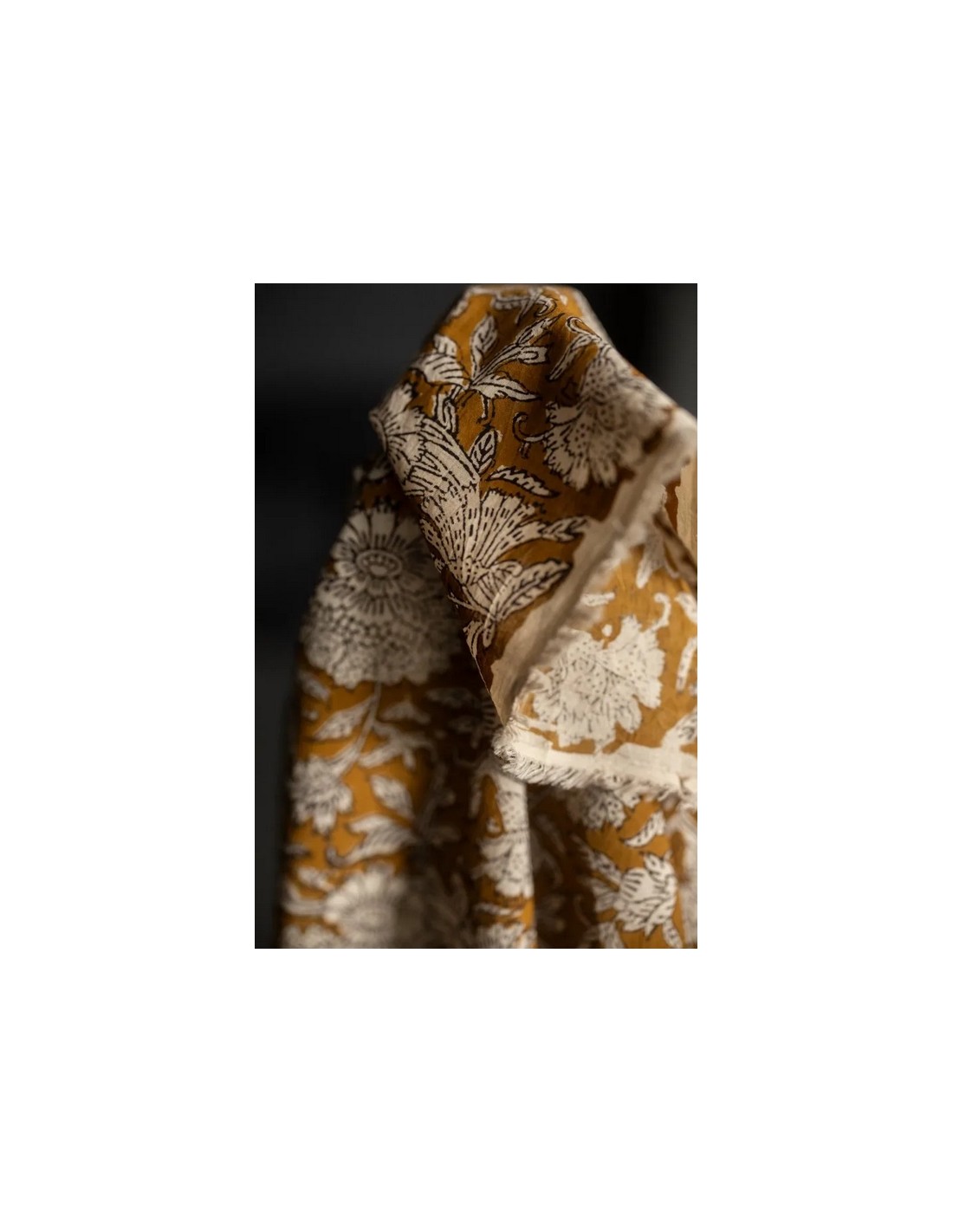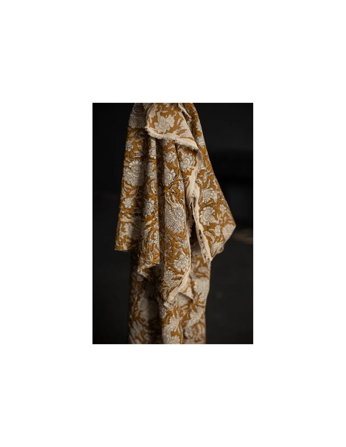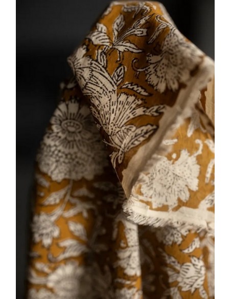 Fabriqué à la main à Jaipur en Inde selon la tradition du block print : un tampon de bois sculpté, trempé dans une teinture végétale puis appliqué à la main sur le tissu. Des méthodes ancestrales qui permettent d'obtenir des teintes naturelles et des irrégularités qui font tout le charme du tissu.